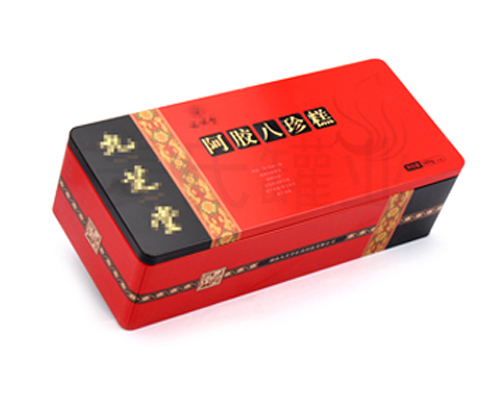 此款阿膠鐵盒包裝為新穎的封口方型造型設計,220*125*55mmH尺寸,可包裝375g不等的阿膠產品。為了順應多樣化的市場包裝需求,這款鐵盒可做成正方形、心形、圓形、橢圓形、異型、車形、書本形等異形造型。