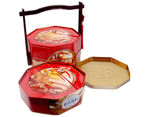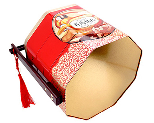此款祥瑞福禮三層六邊形月餅盒的尺寸為250*250*290mm,為了順應(yīng)多樣化的市場包裝需求,這款糖果馬口鐵盒可做成心形、正方形、橢圓形、車形、書本形等異形造型。